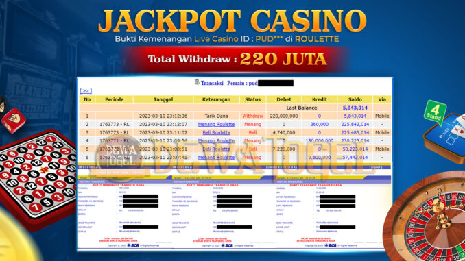 MEMBER DEWATOGEL MENERIMA PELUNASAN KEMENANGAN LIVE CASINO ROULETTE RP 220.000.000,- LUNAS
