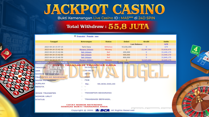 DEWATOGEL JACKPOT LIVE CASINO 24D RP 55.800.000 ,- LUNAS