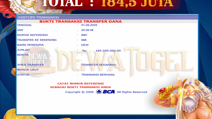 DEWATOGEL mengucapkan selamat kepada user id : HYD*** yang telah berhasil mendapatkan jackpot pada permainan SLOT DI GATES OF OLYMPUS. Kemenangan sebesar Rp 184.500.000,-. telah dibayarkan LUNAS oleh pihak dewatogel kepada pemilik user id setelah yang bersangkutan mengisi formulir withdraw. Proses pencairan dana berlangsung sangat cepat hanya dalam waktu 5-10 menit sudah berada dalam rekening pemilik user id. Bukti transfer yang dapat anda lihat adalah bukti SAH / VALID yang langsung di dapatkan melalui bukti transaksi dari Bank yang digunakan untuk pengiriman dana pada rekening pemilik user id. Terima kasih kami sampaikan kepada para pengguna setia DEWATOGEL yang telah menggunakan situs kami, sebagai Bandar Terpercaya yang pastinya membayar semua kemenangan member hingga lunas. Apakah DEWATOGEL PENIPU ? Reputasi “DEWATOGEL TERPERCAYA” sudah sangat melekat. puluhan hingga ratusan ribu pengguna setia DEWATOGEL tetap menggunakan situs terbesar dan terbaik di Indonesia ini. Hapus rasa was-was dan khawatir anda, kemenangan anda berapapun PASTI dibayarkan hingga lunas.