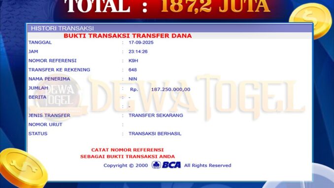 DEWATOGEL mengucapkan selamat kepada user id : KEB*** yang telah berhasil mendapatkan jackpot pada permainan TOGEL DI HONGKONG LOTTO. Kemenangan sebesar Rp 187.200.000,-. telah dibayarkan LUNAS oleh pihak dewatogel kepada pemilik user id setelah yang bersangkutan mengisi formulir withdraw. Proses pencairan dana berlangsung sangat cepat hanya dalam waktu 5-10 menit sudah berada dalam rekening pemilik user id. Bukti transfer yang dapat anda lihat adalah bukti SAH / VALID yang langsung di dapatkan melalui bukti transaksi dari Bank yang digunakan untuk pengiriman dana pada rekening pemilik user id. Terima kasih kami sampaikan kepada para pengguna setia DEWATOGEL yang telah menggunakan situs kami, sebagai Bandar Terpercaya yang pastinya membayar semua kemenangan member hingga lunas. Apakah DEWATOGEL PENIPU ? Reputasi “DEWATOGEL TERPERCAYA” sudah sangat melekat. puluhan hingga ratusan ribu pengguna setia DEWATOGEL tetap menggunakan situs terbesar dan terbaik di Indonesia ini. Hapus rasa was-was dan khawatir anda, kemenangan anda berapapun PASTI dibayarkan hingga lunas.