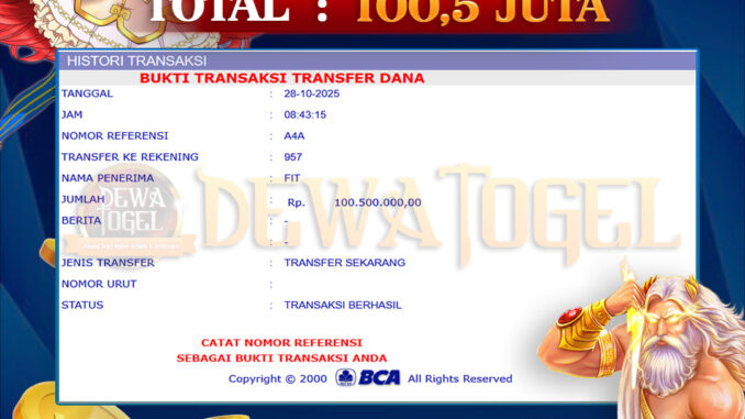 DEWATOGEL mengucapkan selamat kepada user id : S2W*** yang telah berhasil mendapatkan jackpot pada permainan SLOT DI JOKER JEWEL. Kemenangan sebesar Rp 100.500.000,-. telah dibayarkan LUNAS oleh pihak dewatogel kepada pemilik user id setelah yang bersangkutan mengisi formulir withdraw. Proses pencairan dana berlangsung sangat cepat hanya dalam waktu 5-10 menit sudah berada dalam rekening pemilik user id. Bukti transfer yang dapat anda lihat adalah bukti SAH / VALID yang langsung di dapatkan melalui bukti transaksi dari Bank yang digunakan untuk pengiriman dana pada rekening pemilik user id. Terima kasih kami sampaikan kepada para pengguna setia DEWATOGEL yang telah menggunakan situs kami, sebagai Bandar Terpercaya yang pastinya membayar semua kemenangan member hingga lunas. Apakah DEWATOGEL PENIPU ? Reputasi “DEWATOGEL TERPERCAYA” sudah sangat melekat. puluhan hingga ratusan ribu pengguna setia DEWATOGEL tetap menggunakan situs terbesar dan terbaik di Indonesia ini. Hapus rasa was-was dan khawatir anda, kemenangan anda berapapun PASTI dibayarkan hingga lunas.